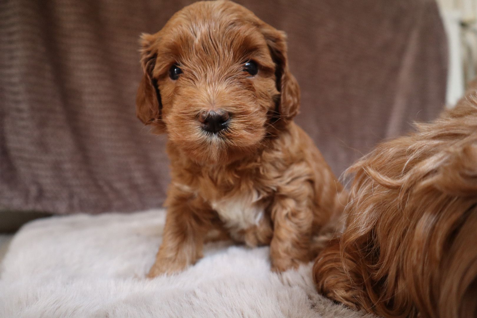 Qua uiterlijk groeit Momo uit tot een prachtige vertegenwoordiger van het ras: een volle, zijdezachte fleece vacht en mooie expressieve ogen die haar lieve karakter weerspiegelen. Hoewel ze nog jong is, toont ze nu al een prachtige combinatie van stabiliteit, zachtheid en speelsheid — precies wat we zo waarderen in de Australian Labradoodle.